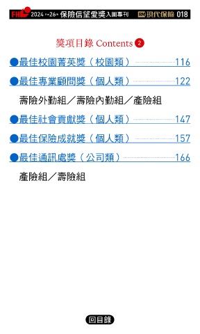 2024 26 ڭᎈڦૐฌᆤ ɝఖਖ਼̊ 018 the th 獎項目錄 Contents 2 ● 最佳校園菁英獎(校園類) 116 ● 最佳專業顧問獎(個人類) 122 壽險外勤組/壽險內勤組/產險組 ● 最佳社會貢獻獎(個人類) 147 ● 最佳保險成就獎(個人類) 157 ● 最佳通訊處獎(公司類) 166 產險組/壽險組 Ϋͦ