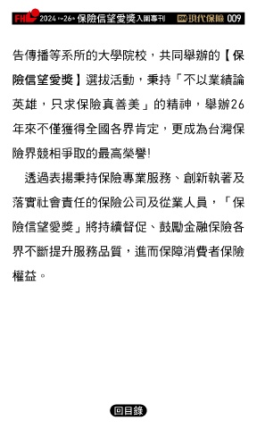 2024 26 ڭᎈڦૐฌᆤ ɝఖਖ਼̊ 009 th the 告傳播等系所的大學院校,共同舉辦的ڭ ᎈڦૐฌᆤ選拔活動,秉持「不以業績論 英雄,只求保險真善美」的精神,舉辦26 年來不僅獲得全國各界肯定,更成為台灣保 險界競相爭取的最高榮譽! 透過表揚秉持保險專業服務、創新執著及 落實社會責任的保險公司及從業人員,「保 險信望愛獎」將持續督促、鼓勵金融保險各 界不斷提升服務品質,進而保障消費者保險 權益。 Ϋͦ