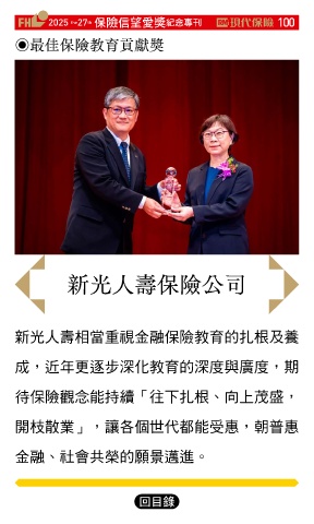 2025 27 ڭᎈڦૐฌᆤ ߏׂਖ਼̊ 100 the th ◉最佳保險教育貢獻獎 新光人壽保險公司 新光人壽相當重視金融保險教育的扎根及養 成,近年更逐步深化教育的深度與廣度,期 待保險觀念能持續「往下扎根、向上茂盛, 開枝散業」,讓各個世代都能受惠,朝普惠 金融、社會共榮的願景邁進。 Ϋͦ