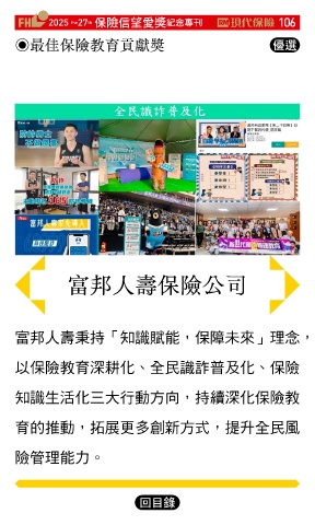 2025 27 ڭᎈڦૐฌᆤ ߏׂਖ਼̊ 106 the th ◉最佳保險教育貢獻獎 Ꮄ፯ 富邦人壽保險公司 富邦人壽秉持「知識賦能,保障未來」理念, 以保險教育深耕化、全民識詐普及化、保險 知識生活化三大行動方向,持續深化保險教 育的推動,拓展更多創新方式,提升全民風 險管理能力。 Ϋͦ