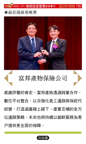 2025 27 ڭᎈڦૐฌᆤ ߏׂਖ਼̊ 110 the th ◉最佳通路策略獎 富邦產物保險公司 感謝評審的肯定,富邦產險透過跨業合作、 數位平台整合,以及強化員工通路與保經代 經營,打造涵蓋線上線下、虛實互補的全方 位通路策略,未來也將持續以創新服務為客 戶提供更全面的保障。 Ϋͦ