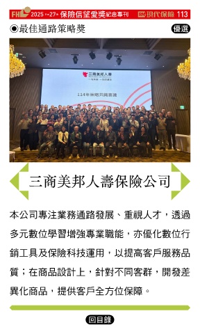 2025 27 ڭᎈڦૐฌᆤ ߏׂਖ਼̊ 113 th the ◉最佳通路策略獎 Ꮄ፯ Ꮄ፯ 三商美邦人壽保險公司 本公司專注業務通路發展、重視人才,透過 多元數位學習增強專業職能,亦優化數位行 銷工具及保險科技運用,以提高客戶服務品 質;在商品設計上,針對不同客群,開發差 異化商品,提供客戶全方位保障。 Ϋͦ