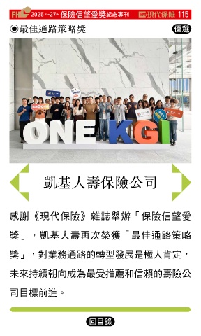2025 27 ڭᎈڦૐฌᆤ ߏׂਖ਼̊ 115 th the ◉最佳通路策略獎 Ꮄ፯ Ꮄ፯ 凱基人壽保險公司 感謝《現代保險》雜誌舉辦「保險信望愛 獎」,凱基人壽再次榮獲「最佳通路策略 獎」,對業務通路的轉型發展是極大肯定, 未來持續朝向成為最受推薦和信賴的壽險公 司目標前進。 Ϋͦ