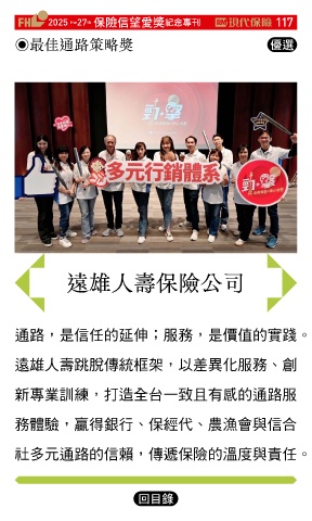 2025 27 ڭᎈڦૐฌᆤ ߏׂਖ਼̊ 117 th the ◉最佳通路策略獎 Ꮄ፯ Ꮄ፯ 遠雄人壽保險公司 通路,是信任的延伸;服務,是價值的實踐。 遠雄人壽跳脫傳統框架,以差異化服務、創 新專業訓練,打造全台一致且有感的通路服 務體驗,贏得銀行、保經代、農漁會與信合 社多元通路的信賴,傳遞保險的溫度與責任。 Ϋͦ