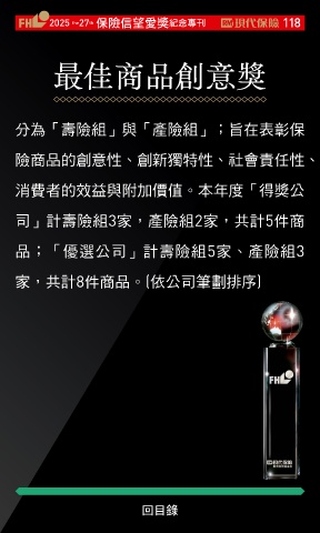 2025 27 ڭᎈڦૐฌᆤ ߏׂਖ਼̊ 118 the th 最佳商品創意獎 分為「壽險組」與「產險組」;旨在表彰保 險商品的創意性、創新獨特性、社會責任性、 消費者的效益與附加價值。本年度「得獎公 司」計壽險組3家,產險組2家,共計5件商 品;「優選公司」計壽險組5家、產險組3 家,共計8件商品。(依公司筆劃排序) Ϋͦ