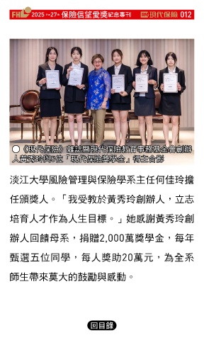 2025 27 ڭᎈڦૐฌᆤ ߏׂਖ਼̊ 012 th the ●《現代保險》雜誌暨現代保險教育事務基金會創辦 ●《現代保險》雜誌暨現代保險教育事務基金會創辦 人黃秀玲與5位「現代保險獎學金」得主合影 人黃秀玲與5位「現代保險獎學金」得主合影 淡江大學風險管理與保險學系主任何佳玲擔 任頒獎人。「我受教於黃秀玲創辦人,立志 培育人才作為人生目標。」她感謝黃秀玲創 辦人回饋母系,捐贈2,000萬獎學金,每年 甄選五位同學,每人獎助20萬元,為全系 師生帶來莫大的鼓勵與感動。 Ϋͦ