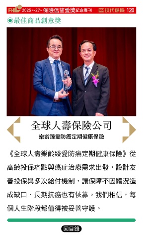 2025 27 ڭᎈڦૐฌᆤ ߏׂਖ਼̊ 120 th the ◉最佳商品創意獎 全球人壽保險公司 ᆀᙧጲฌԣᐖ֛ಂੰڭᎈ 《全球人壽樂齡臻愛防癌定期健康保險》從 高齡投保痛點與癌症治療需求出發,設計友 善投保與多次給付機制,讓保障不因體況造 成缺口、長期抗癌也有依靠。我們相信,每 個人生階段都值得被妥善守護。 Ϋͦ