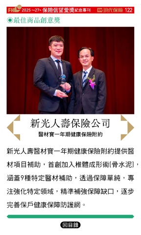 2025 27 ڭᎈڦૐฌᆤ ߏׂਖ਼̊ 122 th the ◉最佳商品創意獎 新光人壽保險公司 ᔼҿᘒɓϋಂੰڭᎈڝߒ 新光人壽醫材寶一年期健康保險附約提供醫 材項目補助,首創加入椎體成形術(骨水泥), 涵蓋9種特定醫材補助,透過保障單純,專 注強化特定領域,精準補強保障缺口,逐步 完善保戶健康保障防護網。 Ϋͦ