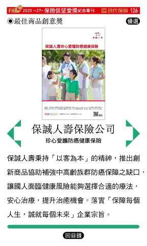 2025 27 ڭᎈڦૐฌᆤ ߏׂਖ਼̊ 126 th the ◉最佳商品創意獎 Ꮄ፯ 保誠人壽保險公司 ޜːฌᚐԣᐖੰڭᎈ 保誠人壽秉持「以客為本」的精神,推出創 新商品協助補強中高齡族群防癌保障之缺口, 讓國人面臨健康風險能夠選擇合適的療法, 安心治療,提升治癒機會。落實「保障每個 人生,誠就每個未來」企業宗旨。 Ϋͦ