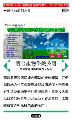 2025 27 ڭᎈڦૐฌᆤ ߏׂਖ਼̊ 133 th the ◉最佳商品創意獎 Ꮄ፯ 明台產物保險公司 ฆۨИσၠঐਗପၝΥڭᎈ 面對氣候變遷與綠色轉型的全球趨勢,我們 創新結合住宅保障與綠能設備承保,回應低 碳生活及能源安全的新興風險,感謝投入商 品研發的同仁努力及母公司資源支持,希望 繼續實踐對永續未來的承諾。 Ϋͦ