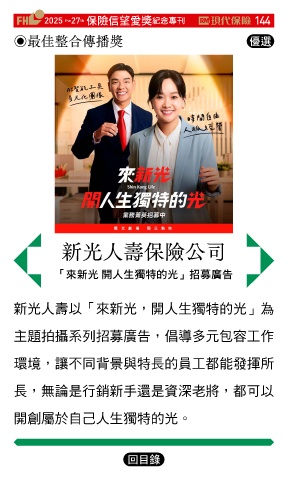 2025 27 ڭᎈڦૐฌᆤ ߏׂਖ਼̊ 144 the th ◉最佳整合傳播獎 Ꮄ፯ 新光人壽保險公司 ԸอΈ කɛ͛ዹतٙΈםᄿѓ 新光人壽以「來新光,開人生獨特的光」為 主題拍攝系列招募廣告,倡導多元包容工作 環境,讓不同背景與特長的員工都能發揮所 長,無論是行銷新手還是資深老將,都可以 開創屬於自己人生獨特的光。 Ϋͦ