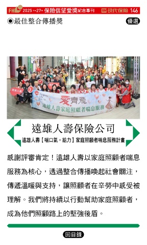 2025 27 ڭᎈڦૐฌᆤ ߏׂਖ਼̊ 146 the th ◉最佳整合傳播獎 Ꮄ፯ 遠雄人壽保險公司 Ⴣඪɛྪఁɹंfഗɢࢬᚥ٫ఁࢹਕࠇ 感謝評審肯定!遠雄人壽以家庭照顧者喘息 服務為核心,透過整合傳播喚起社會關注, 傳遞溫暖與支持,讓照顧者在辛勞中感受被 理解。我們將持續以行動幫助家庭照顧者, 成為他們照顧路上的堅強後盾。 Ϋͦ