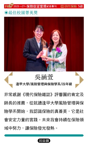 2025 27 ڭᎈڦૐฌᆤ ߏׂਖ਼̊ 148 th the ◉最佳校園菁英獎 吳涵萱 ு͠ɽኪ/ࠬᎈ၍ଣၾڭᎈኪӻ/̬ϋॴ 非常感謝《現代保險雜誌》評審團的肯定及 師長的推薦,從就讀逢甲大學風險管理與保 險學系開始,我認識保險的真善美,它是社 會安定力量的實踐。未來我會持續在保險領 域中努力,讓保險發光發熱。 Ϋͦ
