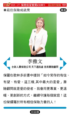 2025 27 ڭᎈڦૐฌᆤ ߏׂਖ਼̊ 159 th the ◉最佳保險成就獎 Ꮄ፯ 李雅文 ̨อɛྪڭᎈʮ̡ ˂ɨஷৃஈ ࢩྪᎈᚥਪ 保羅在歌林多前書中提到「如今常存的有信、 有望、有愛。這三樣,其中最大的是愛」壽 險顧問就是愛的使者。我會用更專業、更溫 暖、更創新的方式,繼續守護每個家庭!這 份榮耀屬於所有相信保險力量的人! Ϋͦ