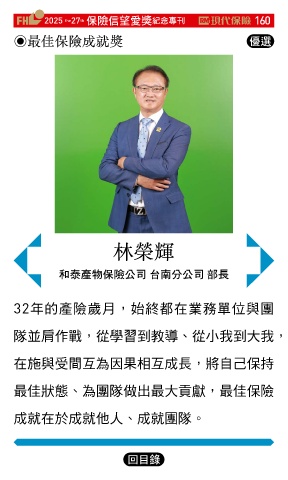 2025 27 ڭᎈڦૐฌᆤ ߏׂਖ਼̊ 160 th the ◉最佳保險成就獎 Ꮄ፯ 林榮輝 ձइପيڭᎈʮ̡ ̨یʱʮ̡ ڗ 32年的產險歲月,始終都在業務單位與團 隊並肩作戰,從學習到教導、從小我到大我, 在施與受間互為因果相互成長,將自己保持 最佳狀態、為團隊做出最大貢獻,最佳保險 成就在於成就他人、成就團隊。 Ϋͦ