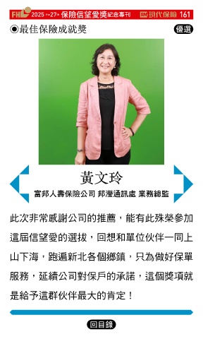 2025 27 ڭᎈڦૐฌᆤ ߏׂਖ਼̊ 161 th the ◉最佳保險成就獎 Ꮄ፯ 黃文玲 బԞɛྪڭᎈʮ̡ Ԟ⽆ஷৃஈ ุਕᐼ္ 此次非常感謝公司的推薦,能有此殊榮參加 這屆信望愛的選拔,回想和單位伙伴一同上 山下海,跑遍新北各個鄉鎮,只為做好保單 服務,延續公司對保戶的承諾,這個獎項就 是給予這群伙伴最大的肯定! Ϋͦ