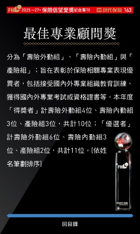 2025 27 ڭᎈڦૐฌᆤ ߏׂਖ਼̊ 163 th the 最佳專業顧問獎 分為「壽險外勤組」、「壽險內勤組」與「 產險組」;旨在表彰於保險相關專業表現優 異者,包括接受國內外專業組織教育訓練、 獲得國內外專業考試或資格證書等。本年度 「得獎者」計壽險外勤組4位、壽險內勤組 3位、產險組3位,共計10位;「優選者」 計壽險外勤組6位、壽險內勤組3 位、產險組2位,共計11位。(依姓 名筆劃排序) ●頒獎人:世新大學校長 陳清河 Ϋͦ