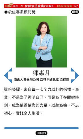 2025 27 ڭᎈڦૐฌᆤ ߏׂਖ਼̊ 172 the th ◉最佳專業顧問獎 Ꮄ፯ 鄧惠月 یʆɛྪڭᎈʮ̡ 㒥۬ʕஷৃஈ ਜଣ 這份榮耀,來自每一次全力以赴的選擇。專 業,不是為了證明自己,而是為了在關鍵時 刻,成為值得依靠的力量。以終為始,不忘 初心,實踐全人生活。 Ϋͦ