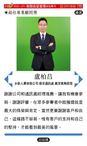 2025 27 ڭᎈڦૐฌᆤ ߏׂਖ਼̊ 173 th the ◉最佳專業顧問獎 Ꮄ፯ 盧柏昌 ̨อɛྪڭᎈʮ̡ یԯஷৃஈ ༟ଉุਕଣ 謝謝公司和通訊處經理推薦,讓我有機會參 與。謝謝評審,在眾多參賽者中能獲獎就是 最大的殊榮與肯定。當然更要謝謝客戶和自 己,這條路不容易,惟有客戶的支持和自己 的堅持,才能看到最美的風景。 Ϋͦ