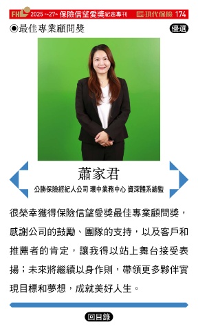2025 27 ڭᎈڦૐฌᆤ ߏׂਖ਼̊ 174 th the ◉最佳專業顧問獎 Ꮄ፯ 蕭家君 ʮ௷ڭᎈߏɛʮ̡ ᐑʕุਕʕː ༟ଉӻᐼ္ 很榮幸獲得保險信望愛獎最佳專業顧問獎, 感謝公司的鼓勵、團隊的支持,以及客戶和 推薦者的肯定,讓我得以站上舞台接受表 揚;未來將繼續以身作則,帶領更多夥伴實 現目標和夢想,成就美好人生。 Ϋͦ
