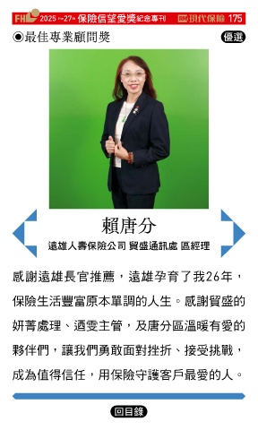 2025 27 ڭᎈڦૐฌᆤ ߏׂਖ਼̊ 175 th the ◉最佳專業顧問獎 Ꮄ፯ 賴唐分 Ⴣඪɛྪڭᎈʮ̡ ൱ସஷৃஈ ਜଣ 感謝遠雄長官推薦,遠雄孕育了我26年, 保險生活豐富原本單調的人生。感謝貿盛的 妍菁處理、迺雯主管,及唐分區溫暖有愛的 夥伴們,讓我們勇敢面對挫折、接受挑戰, 成為值得信任,用保險守護客戶最愛的人。 Ϋͦ
