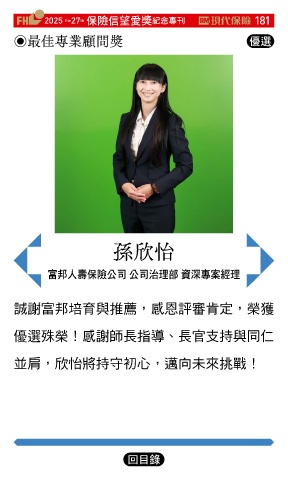 2025 27 ڭᎈڦૐฌᆤ ߏׂਖ਼̊ 181 the th ◉最佳專業顧問獎 Ꮄ፯ 孫欣怡 బԞɛྪڭᎈʮ̡ ʮ̡طଣ ༟ଉਖ਼ࣩଣ 誠謝富邦培育與推薦,感恩評審肯定,榮獲 優選殊榮!感謝師長指導、長官支持與同仁 並肩,欣怡將持守初心,邁向未來挑戰! Ϋͦ