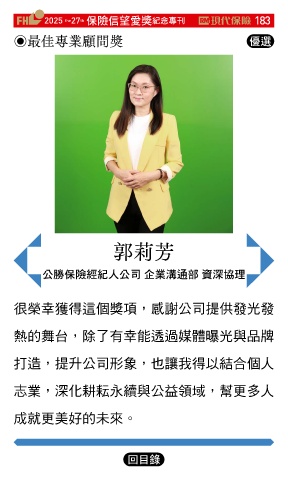 2025 27 ڭᎈڦૐฌᆤ ߏׂਖ਼̊ 183 th the ◉最佳專業顧問獎 Ꮄ፯ 郭莉芳 ʮ௷ڭᎈߏɛʮ̡ Άุ๖ஷ ༟ଉଣ 很榮幸獲得這個獎項,感謝公司提供發光發 熱的舞台,除了有幸能透過媒體曝光與品牌 打造,提升公司形象,也讓我得以結合個人 志業,深化耕耘永續與公益領域,幫更多人 成就更美好的未來。 Ϋͦ