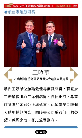 2025 27 ڭᎈڦૐฌᆤ ߏׂਖ਼̊ 185 th the ◉最佳專業顧問獎 王吟華 Ίᔮପيڭᎈʮ̡ جਕج˿፭ృ܃ ج፭ڗ 感謝主辦單位頒給最佳專業顧問獎,有感於 主辦單位用心在每個環節、任何細節,專業 評審團的客觀公正與慎重,此項殊榮見證個 人的堅持與信念,同時替公司爭取無上的榮 耀,感恩之情,難以筆墨形容。 Ϋͦ