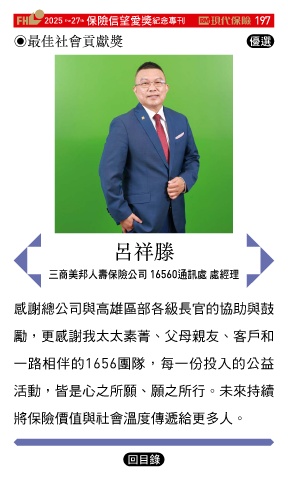 2025 27 ڭᎈڦૐฌᆤ ߏׂਖ਼̊ 197 th the ◉最佳社會貢獻獎 Ꮄ፯ 呂祥滕 ɧਠߕԞɛྪڭᎈʮ̡ 16560ஷৃஈ ஈଣ 感謝總公司與高雄區部各級長官的協助與鼓 勵,更感謝我太太素菁、父母親友、客戶和 一路相伴的1656團隊,每一份投入的公益 活動,皆是心之所願、願之所行。未來持續 將保險價值與社會溫度傳遞給更多人。 Ϋͦ