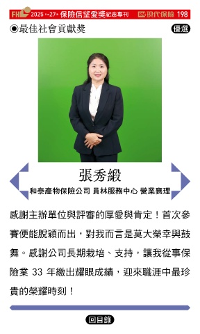 2025 27 ڭᎈڦૐฌᆤ ߏׂਖ਼̊ 198 th the ◉最佳社會貢獻獎 Ꮄ፯ 張秀緞 ձइପيڭᎈʮ̡ ࡰ؍ਕʕː ᐄุᑳଣ 感謝主辦單位與評審的厚愛與肯定!首次參 賽便能脫穎而出,對我而言是莫大榮幸與鼓 舞。感謝公司長期栽培、支持,讓我從事保 險業 33 年繳出耀眼成績,迎來職涯中最珍 貴的榮耀時刻! Ϋͦ