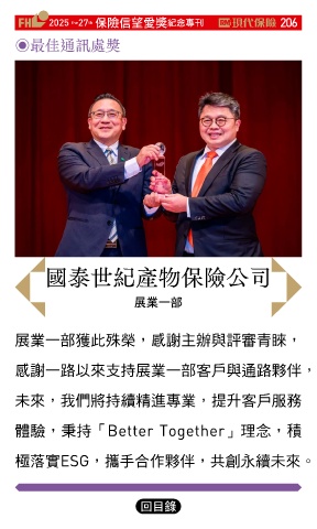 2025 27 ڭᎈڦૐฌᆤ ߏׂਖ਼̊ 206 th the ◉最佳通訊處獎 國泰世紀產物保險公司 ุ࢝ɓ 展業一部獲此殊榮,感謝主辦與評審青睞, 感謝一路以來支持展業一部客戶與通路夥伴, 未來,我們將持續精進專業,提升客戶服務 體驗,秉持「Better Together」理念,積 極落實ESG,攜手合作夥伴,共創永續未來。 Ϋͦ