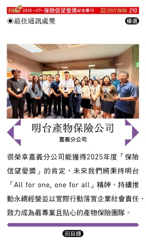 2025 27 ڭᎈڦૐฌᆤ ߏׂਖ਼̊ 210 th the ◉最佳通訊處獎 Ꮄ፯ 明台產物保險公司 ྗ່ʱʮ̡ 很榮幸嘉義分公司能獲得2025年度「保險 信望愛獎」的肯定,未來我們將秉持明台 「All for one, one for all」精神,持續推 動永續經營並以實際行動落實企業社會責任, 致力成為最專業且貼心的產物保險團隊。 Ϋͦ