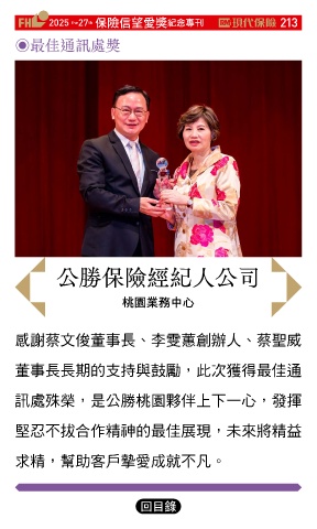 2025 27 ڭᎈڦૐฌᆤ ߏׂਖ਼̊ 213 th the ◉最佳通訊處獎 公勝保險經紀人公司 ุࣹਕʕː 感謝蔡文俊董事長、李雯蕙創辦人、蔡聖威 董事長長期的支持與鼓勵,此次獲得最佳通 訊處殊榮,是公勝桃園夥伴上下一心,發揮 堅忍不拔合作精神的最佳展現,未來將精益 求精,幫助客戶摯愛成就不凡。 Ϋͦ