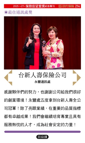 2025 27 ڭᎈڦૐฌᆤ ߏׂਖ਼̊ 214 th the ◉最佳通訊處獎 台新人壽保險公司 ͑ᔮஷৃஈ 感謝夥伴們的努力,也謝謝公司給我們很好 的創業環境!永豐處五度拿到台新人壽全公 司冠軍!除了亮眼業績,在重要的品質指標 都有卓越成果!我們會繼續培育專業且具有 服務熱忱的人才,成為社會安定的力量! Ϋͦ