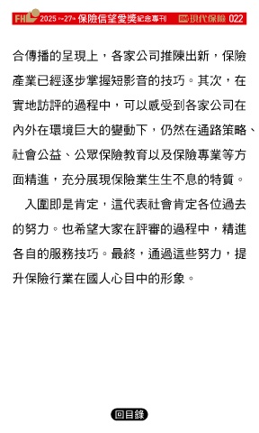 2025 27 ڭᎈڦૐฌᆤ ߏׂਖ਼̊ 022 th the 合傳播的呈現上,各家公司推陳出新,保險 產業已經逐步掌握短影音的技巧。其次,在 實地訪評的過程中,可以感受到各家公司在 內外在環境巨大的變動下,仍然在通路策略、 社會公益、公眾保險教育以及保險專業等方 面精進,充分展現保險業生生不息的特質。 入圍即是肯定,這代表社會肯定各位過去 的努力。也希望大家在評審的過程中,精進 各自的服務技巧。最終,通過這些努力,提 升保險行業在國人心目中的形象。 Ϋͦ