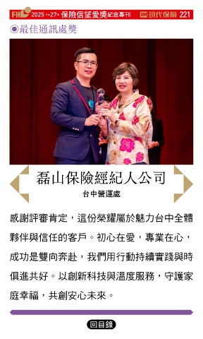 2025 27 ڭᎈڦૐฌᆤ ߏׂਖ਼̊ 221 th the ◉最佳通訊處獎 磊山保險經紀人公司 ̨ʕᐄ༶ஈ 感謝評審肯定,這份榮耀屬於魅力台中全體 夥伴與信任的客戶。初心在愛,專業在心, 成功是雙向奔赴,我們用行動持續實踐與時 俱進共好。以創新科技與溫度服務,守護家 庭幸福,共創安心未來。 Ϋͦ