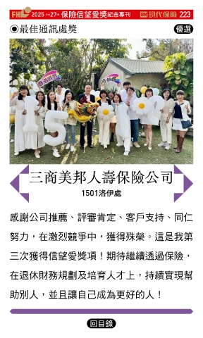 2025 27 ڭᎈڦૐฌᆤ ߏׂਖ਼̊ 223 th the ◉最佳通訊處獎 Ꮄ፯ 三商美邦人壽保險公司 1501ݾͺஈ 感謝公司推薦、評審肯定、客戶支持、同仁 努力,在激烈競爭中,獲得殊榮。這是我第 三次獲得信望愛獎項!期待繼續透過保險, 在退休財務規劃及培育人才上,持續實現幫 助別人,並且讓自己成為更好的人! Ϋͦ