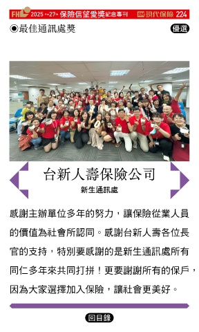 2025 27 ڭᎈڦૐฌᆤ ߏׂਖ਼̊ 224 th the ◉最佳通訊處獎 Ꮄ፯ 台新人壽保險公司 อ͛ஷৃஈ 感謝主辦單位多年的努力,讓保險從業人員 的價值為社會所認同。感謝台新人壽各位長 官的支持,特別要感謝的是新生通訊處所有 同仁多年來共同打拼!更要謝謝所有的保戶, 因為大家選擇加入保險,讓社會更美好。 Ϋͦ