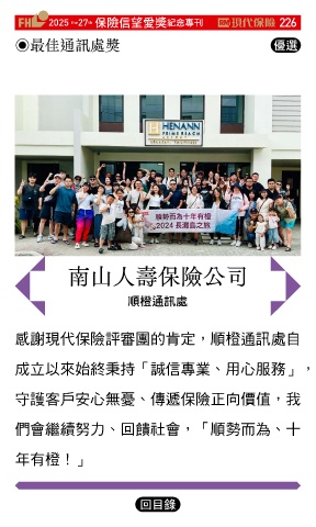 2025 27 ڭᎈڦૐฌᆤ ߏׂਖ਼̊ 226 th the ◉最佳通訊處獎 Ꮄ፯ 南山人壽保險公司 නዐஷৃஈ 感謝現代保險評審團的肯定,順橙通訊處自 成立以來始終秉持「誠信專業、用心服務」, 守護客戶安心無憂、傳遞保險正向價值,我 們會繼續努力、回饋社會,「順勢而為、十 年有橙!」 Ϋͦ