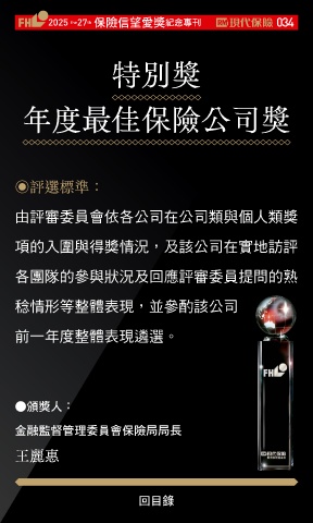 2025 27 ڭᎈڦૐฌᆤ ߏׂਖ਼̊ 034 the th 特別獎 年度最佳保險公司獎 ◉評選標準: 由評審委員會依各公司在公司類與個人類獎 項的入圍與得獎情況,及該公司在實地訪評 各團隊的參與狀況及回應評審委員提問的熟 稔情形等整體表現,並參酌該公司 前一年度整體表現遴選。 µᆤɛj ږፄ္ຖ၍ଣ։ࡰึڭᎈ҅҅ڗ 王麗惠 Ϋͦ