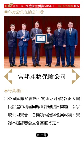 2025 27 ڭᎈڦૐฌᆤ ߏׂਖ਼̊ 035 the th ◉年度最佳保險公司獎 富邦產物保險公司 ◉得獎理由: ① 公司團隊於書審、實地訪評/簡報兩大階 段評選中積極回應各評審提出問題,以爭 取公司榮譽,各獎項均獲得優異成績,榮 獲本屆評審委員會高度肯定。 Ϋͦ