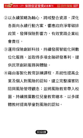 2025 27 ڭᎈڦૐฌᆤ ߏׂਖ਼̊ 037 the th ② 以永續策略為軸心,跨域整合資源,深化 各面向永續行動方案,響應政府淨零碳排 政策,發揮保險影響力,有效實踐企業社 會責任。 ③ 運用保險創新科技,持續發展智能化與數 位化服務,並取得多項金融研發專利,提 供民眾創新服務與體驗。 ④ 藉由客製化教育訓練課程,系統性提高企 業及個人對風險的認知,建立完整損害防 阻與風險管理觀念;並將風險教育帶入校 園,持續推廣數位兒童教育繪本,以多媒 體教材提高學童對風險的認知。 Ϋͦ