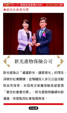 2025 27 ڭᎈڦૐฌᆤ ߏׂਖ਼̊ 059 the th ◉最佳社會責任獎 新光產物保險公司 新光產險以「處處新光,讓愛發光」的理念, 深耕於社會關懷,並積極投入多元公益活動 與自然保育,本屆再次榮獲保險信望愛獎 「最佳社會責任獎」,新光產險將繼續向前 邁進,用愛點亮社會每個角落。 Ϋͦ