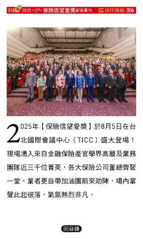 2025 27 ڭᎈڦૐฌᆤ ߏׂਖ਼̊ 006 the th 025年【保險信望愛獎】於8月5日在台 2北國際會議中心(TICC)盛大登場! 現場湧入來自金融保險產官學界高層及業務 團隊近三千位菁英,各大保險公司董總齊聚 一堂,業者更自帶加油團前來助陣,場內掌 聲此起彼落,氣氛熱烈非凡。 Ϋͦ