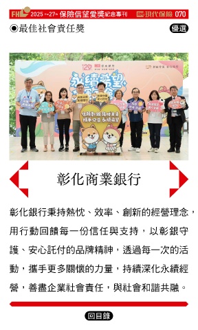 2025 27 ڭᎈڦૐฌᆤ ߏׂਖ਼̊ 070 the th ◉最佳社會責任獎 Ꮄ፯ 彰化商業銀行 彰化銀行秉持熱忱、效率、創新的經營理念, 用行動回饋每一份信任與支持,以彰銀守 護、安心託付的品牌精神,透過每一次的活 動,攜手更多關懷的力量,持續深化永續經 營,善盡企業社會責任,與社會和諧共融。 Ϋͦ