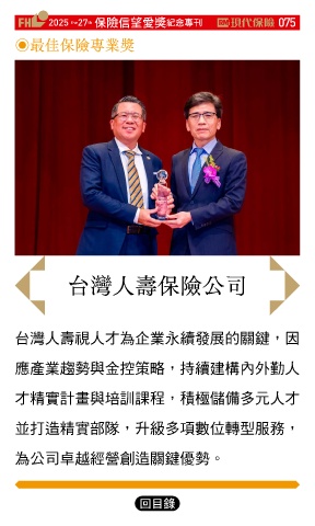 2025 27 ڭᎈڦૐฌᆤ ߏׂਖ਼̊ 075 the th ◉最佳保險專業獎 台灣人壽保險公司 台灣人壽視人才為企業永續發展的關鍵,因 應產業趨勢與金控策略,持續建構內外勤人 才精實計畫與培訓課程,積極儲備多元人才 並打造精實部隊,升級多項數位轉型服務, 為公司卓越經營創造關鍵優勢。 Ϋͦ