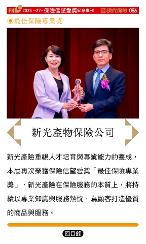 2025 27 ڭᎈڦૐฌᆤ ߏׂਖ਼̊ 086 the th ◉最佳保險專業獎 新光產物保險公司 新光產險重視人才培育與專業能力的養成, 本屆再次榮獲保險信望愛獎「最佳保險專業 獎」,新光產險在保險服務的本質上,將持 續以專業知識與服務熱忱,為顧客打造優質 的商品與服務。 Ϋͦ