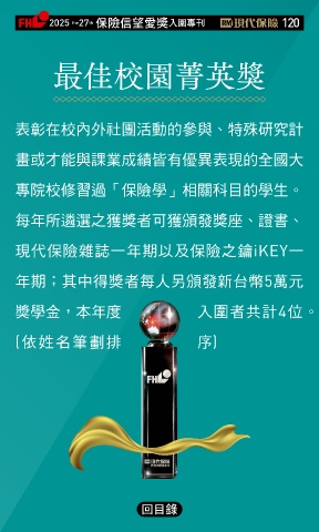 2025 27 ڭᎈڦૐฌᆤ ɝఖਖ਼̊ 120 the th 最佳校園菁英獎 表彰在校內外社團活動的參與、特殊研究計 畫或才能與課業成績皆有優異表現的全國大 專院校修習過「保險學」相關科目的學生。 每年所遴選之獲獎者可獲頒發獎座、證書、 現代保險雜誌一年期以及保險之鑰iKEY一 年期;其中得獎者每人另頒發新台幣5萬元 獎學金,本年度 入圍者共計4位。 (依姓名筆劃排 序) Ϋͦ