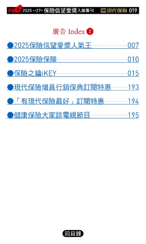 2025 27 ڭᎈڦૐฌᆤ ɝఖਖ਼̊ 019 the th 廣告 Index 2 ●2025保險信望愛獎人氣王 007 ●2025保險保障 010 ●保險之鑰iKEY 015 ●現代保險增員行銷保典訂閱特惠 193 ●「有現代保險最好」訂閱特惠 194 ●健康保險大家談電視節目 195 Ϋͦ