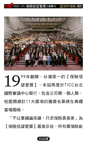 2025 27 ڭᎈڦૐฌᆤ ɝఖਖ਼̊ 003 the th 99年創辦、台灣第一的【保險信 19望愛獎】,本屆再度於TICC台北 國際會議中心舉行,包含公司類、個人類、 校園類總計11大獎項的獲獎名單將在典禮 當場揭曉。 「不以業績論英雄,只求保險真善美」為 【保險信望愛獎】最高宗旨,所有獎項除彰 Ϋͦ